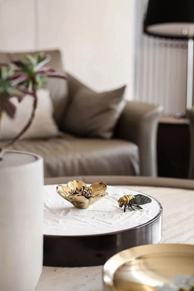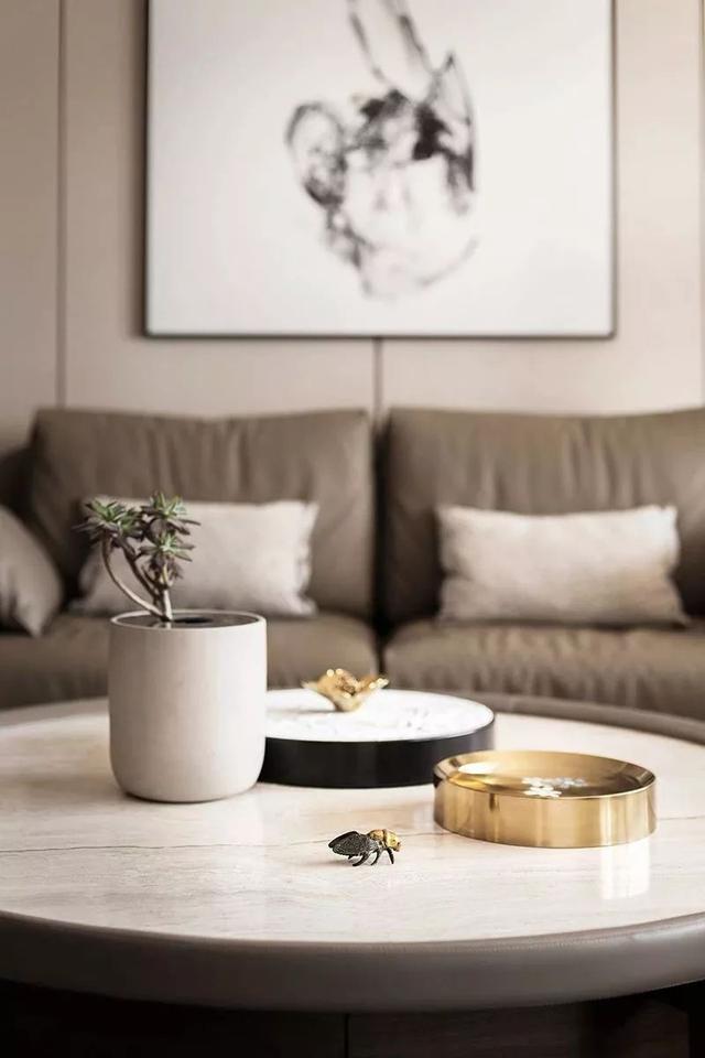 ▲地毯选择了做旧款,配合圆茶几和布艺沙发,整体柔和且温馨;