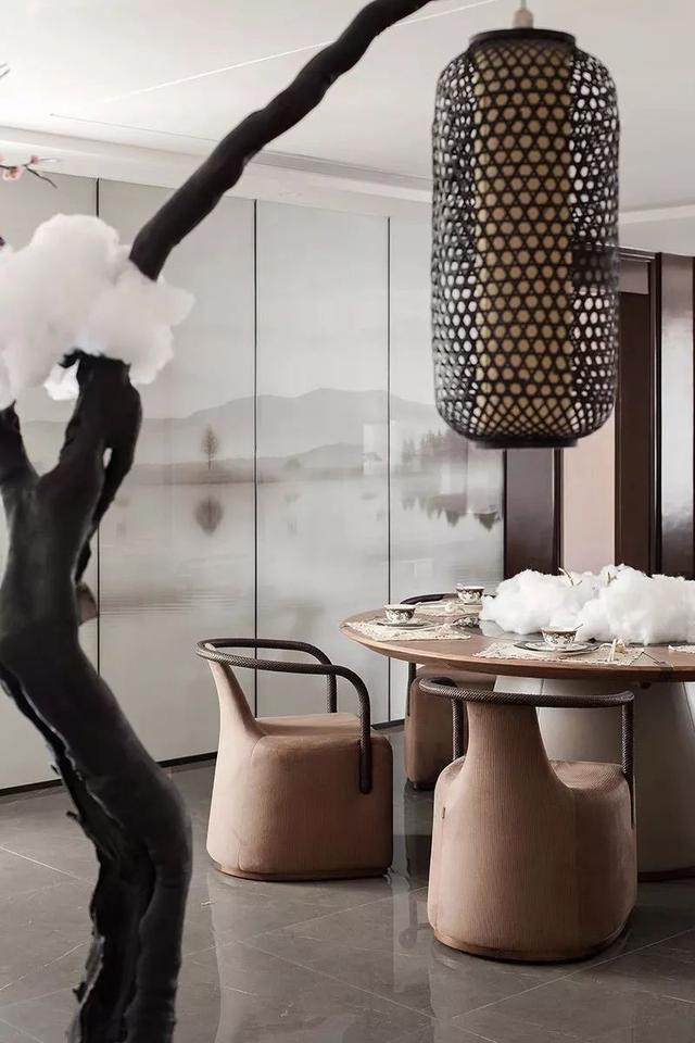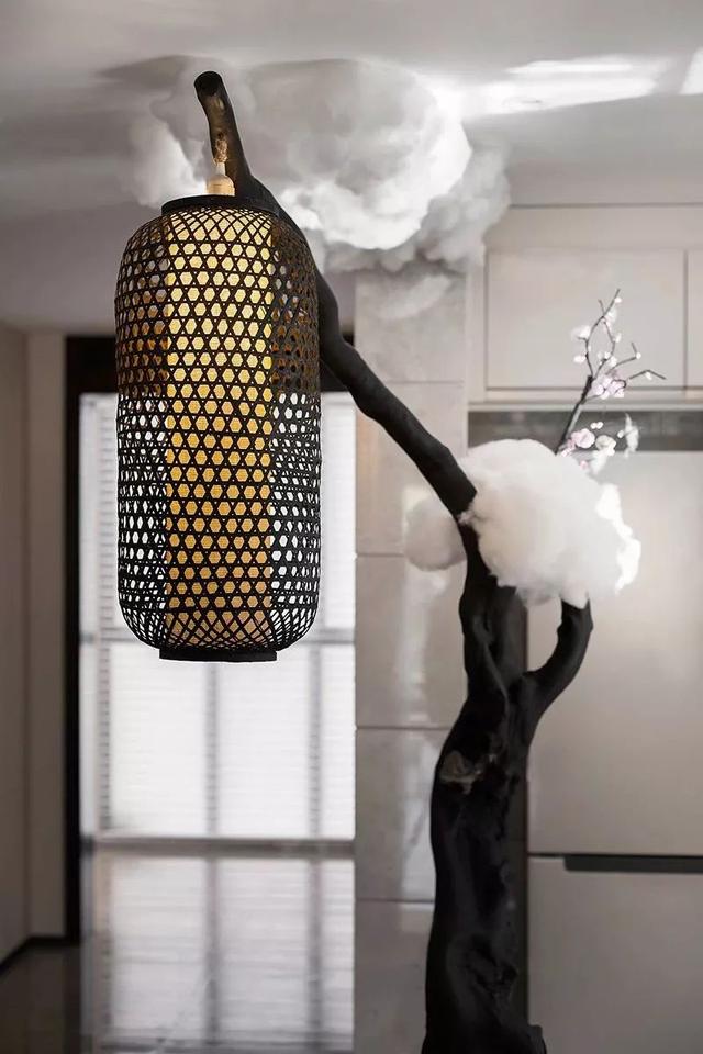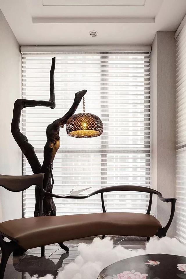 ▲两侧的落地窗搭配百叶帘,遇见一把树枝造型椅和一盏树干摆件上的田园灯,满满的自在轻松;