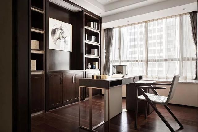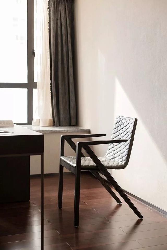 ▲书房中几何造型的书桌和椅子充满简练的现代美感。整墙的书柜,中间挂上一幅马首装饰画,给书房融入了不少自由惬意;