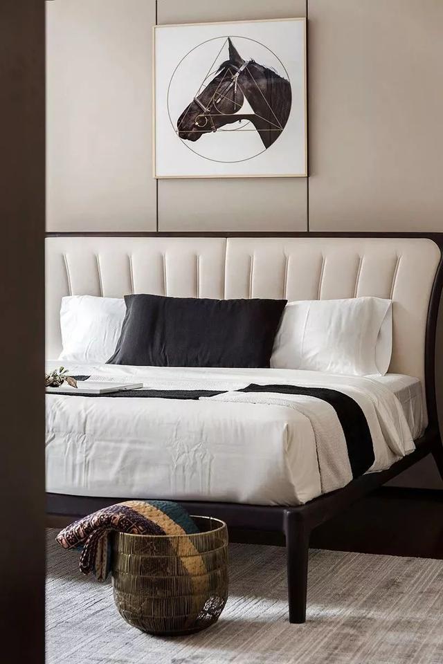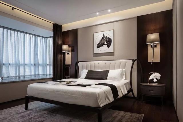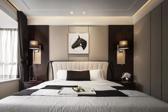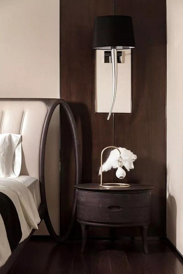 ▲主卧的色调以黑白为主,对称的布局,配合吊顶的光,精致耐看;