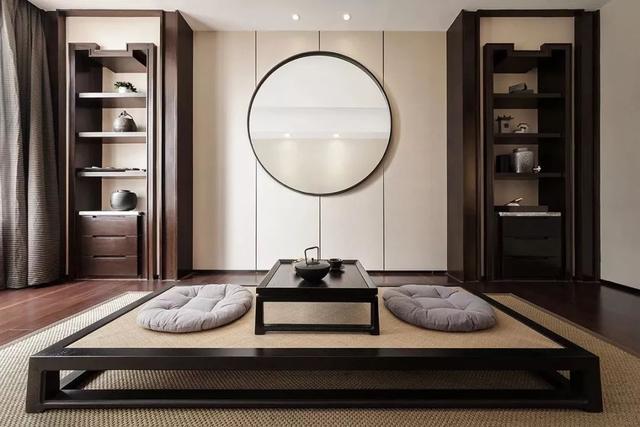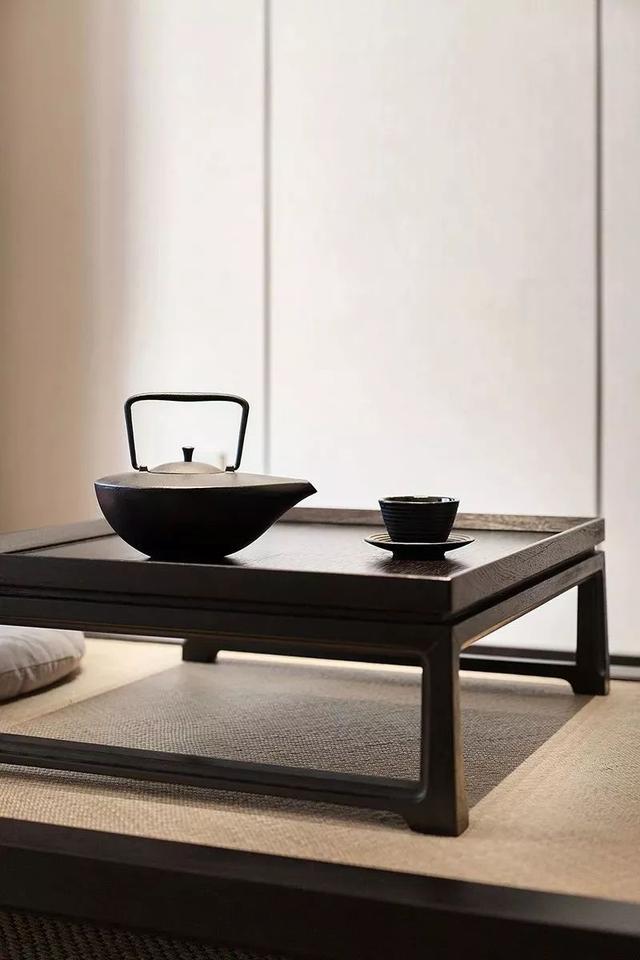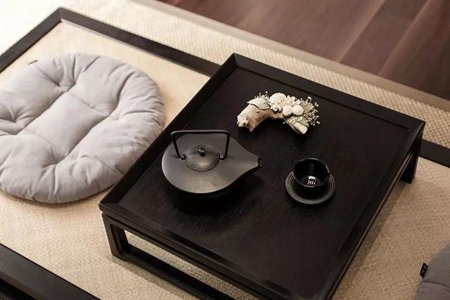 ▲地台上的竹编地毯摆了一个禅意满满的深木色茶台;