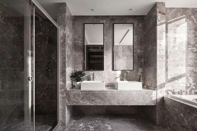 ▲卫生间墙面和地面都是灰调的大理石瓷砖,搭配双人位的洗漱空间,阳光洒入,高级感也紧跟着出来了。