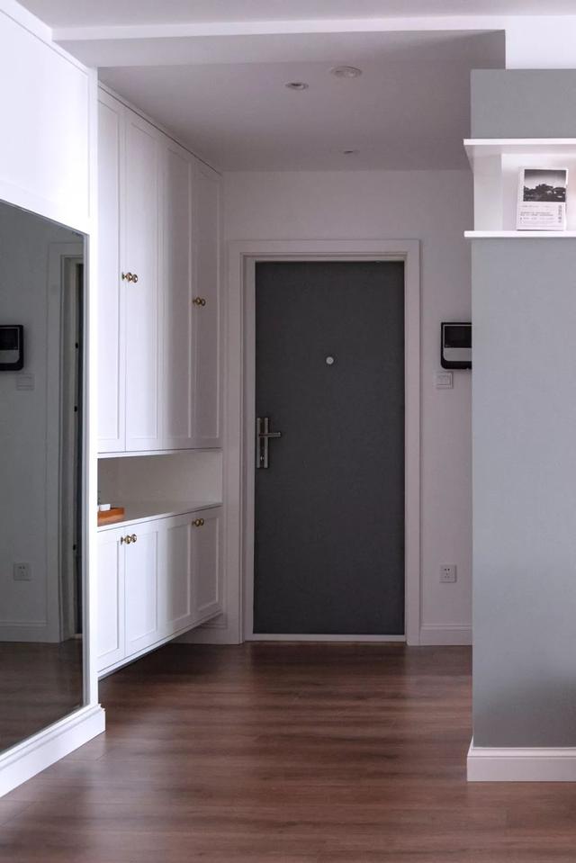 ▲入户玄关处做了嵌入式的到顶鞋柜,白色的鞋柜搭配木色的地面和绿色的入户门,有着一种简约、自然的感觉,鞋柜边上还有大面积的穿衣镜,让玄关能够借到客厅的光线。