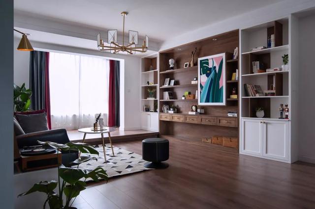 这是一套建筑面积130平米的现代简约风三居室案例,房子整体的搭配给人一种时尚、简洁的感觉,尤其是这个客厅空间,做上了迷你的地台,还把电视给舍弃掉,改成了一面书架、展示墙,把它作为了一个休闲区来使用。