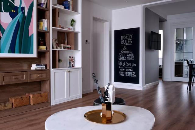 ▲其实电视被放在了餐厅边上的墙上,这样吃饭的时候也能看看电视。墙面还做了部分的黑板墙设计,多出了一些文艺范。