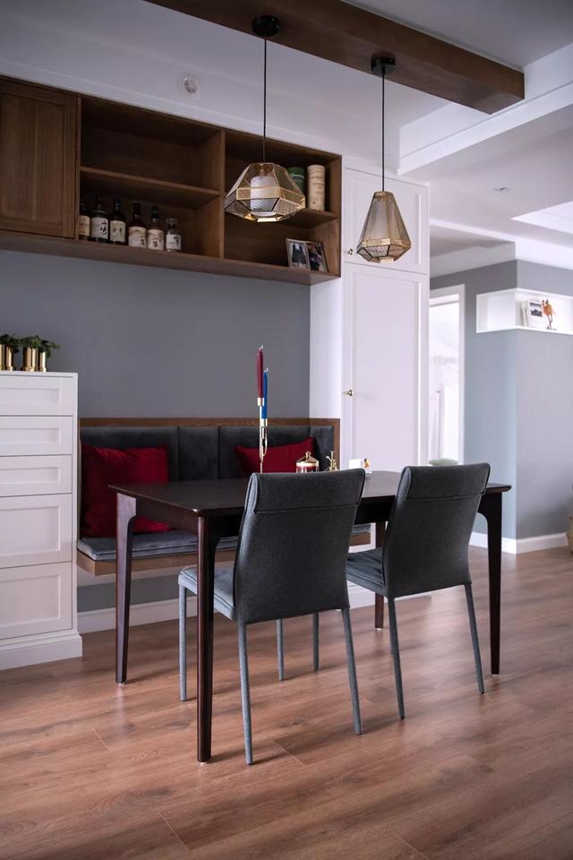 ▲餐厅做了卡座式的餐桌椅,卡座的左右两侧和上方都做了柜子,这样就不用担心家里的储物空间会不够用了,卡座的坐垫和抱枕带来一些复古感。