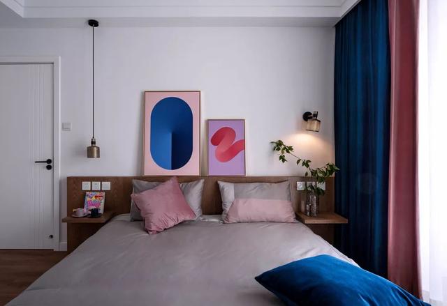 ▲主卧室的床头做了护墙板的设计,还把床头柜结合在了护墙板当中,让整体多出一些简洁感、深蓝色、粉色结合的软装让卧室看起来更有格调。