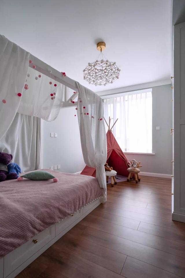 ▲儿童房的软装以粉色为主,墙面被刷成了浅绿色,榻榻米床搭配衣柜和一个小帐篷,让儿童房布局紧凑而又实用,小清新的配色也让人非常喜欢。