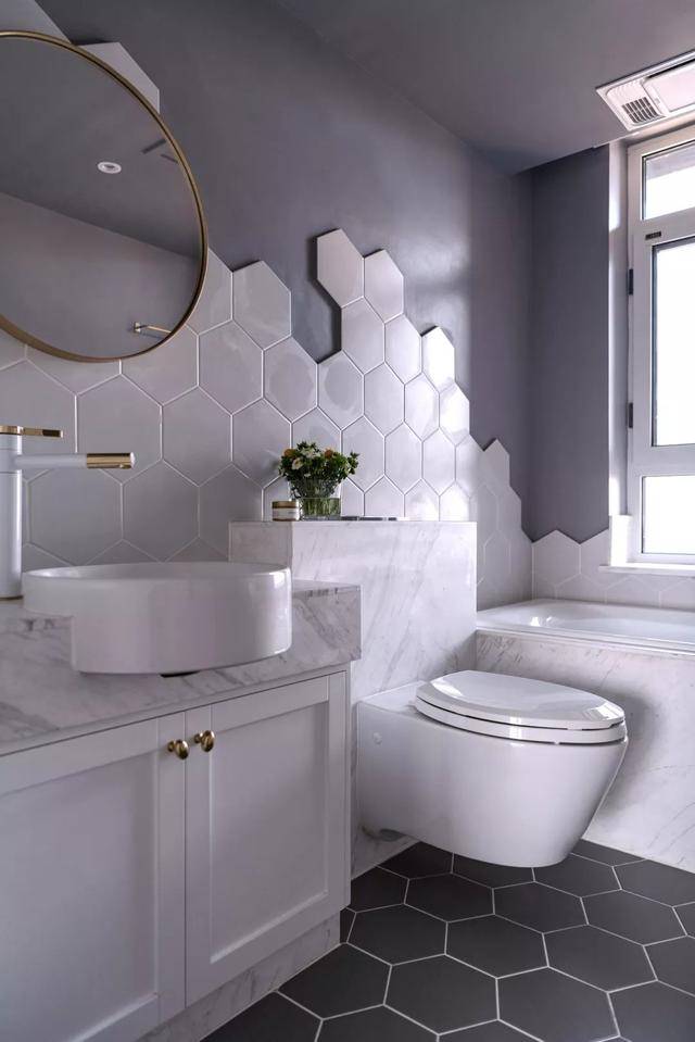 ▲卫生间内的瓷砖铺贴非常有趣,地面是灰色的六边砖,墙面是白色的大理石六边砖和灰色漆的结合,还用浴缸来代替淋浴房,看起来更加美观和惬意。