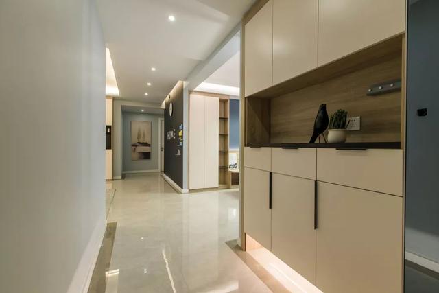 ▲入户的玄关走廊一侧做了到顶的鞋柜,鞋柜的底部留空还加上了藏光设计,白色与木色结合的柜子让人感觉更加舒适。