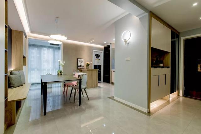 ▲玄关走廊的另一侧是餐厅、厨房和生活阳台空间,餐厅选择了卡座式的设计,卡座的周边空间都被利用起来做了柜子。