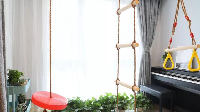 ▲客厅外的阳台也被设计师改成了孩子的娱乐区,梯子加上秋千的设计。边上是绿植和小推车,还有一架钢琴,方便孩子在这里练琴。