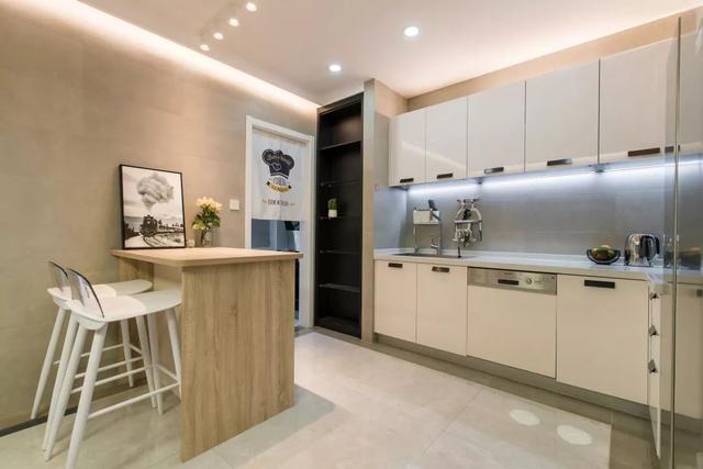 ▲厨房和餐厅之间还有一个小吧台,增添了家里的情调感。L形的橱柜布局,在吊柜底部加上了藏光的设计,顶部的吊顶内嵌灯光,舍弃主灯看起来更加简洁。