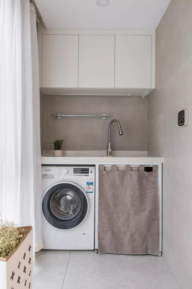 ▲餐厅外的阳台就是做成了生活阳台,洗衣机、洗手台和吊柜的结合,另一侧也是做上了到顶的柜子,灰色调的设计看起来也非常简单轻松。