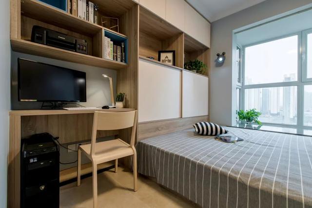 ▲儿童房是选择了榻榻米组合衣柜和书桌的设计,榻榻米的两侧是对称的柜子和书桌,也方便屋主的双胞胎儿子共同使用。