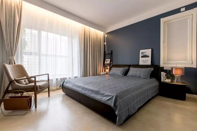 ▲主卧室的颜色是选择了蓝灰色和米色的组合,把冷色调和暖色调结合起来,更有层次感一些。卧室角落里还摆放单椅,作为一个阅读区。