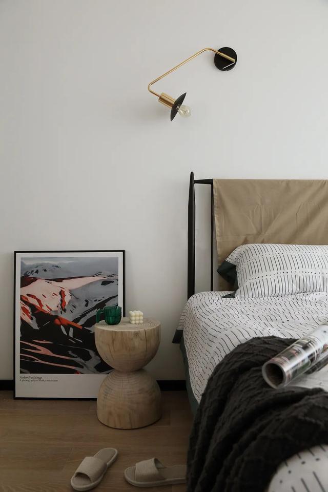 ▲床头墙上的金色壁灯,搭配木质床头柜,简洁精致的布置,也让卧室氛围更加安静舒适。