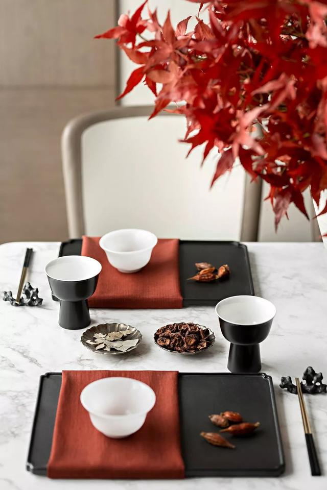 餐厅里则以活泼、热情的枫叶为主景,搭配着同色系的餐具作为呼应,无形中美化了餐厅环境,视觉效果非常惊艳。