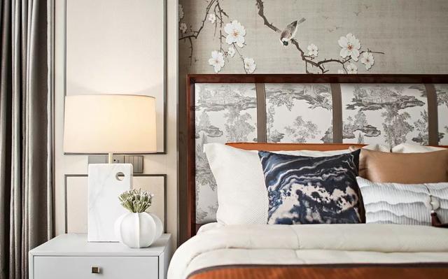 主卧的床头背景墙同样是一大亮点,与客厅的屏风风格非常相似,无论是淡雅的梅花,还是欢快的喜鹊,都有着异曲同工之妙。