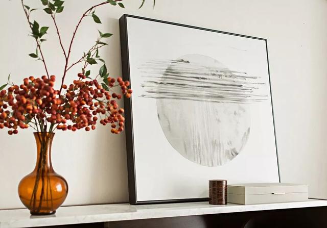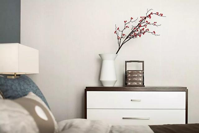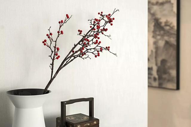 床尾的柜台上放置了一束红梅,旁边配以水墨画作为装饰,让热烈与清雅完美相融,放在新中式居室中再美不过!