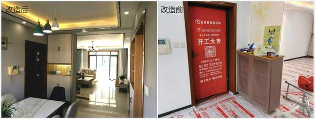 原来入户的地方是一个矮鞋柜,改造后做了一个到顶收纳鞋柜,扩大了收纳空间,中间留空摆放饰品、小物件很方便。同时也巧妙的区分了客厅和餐厅两个区域。