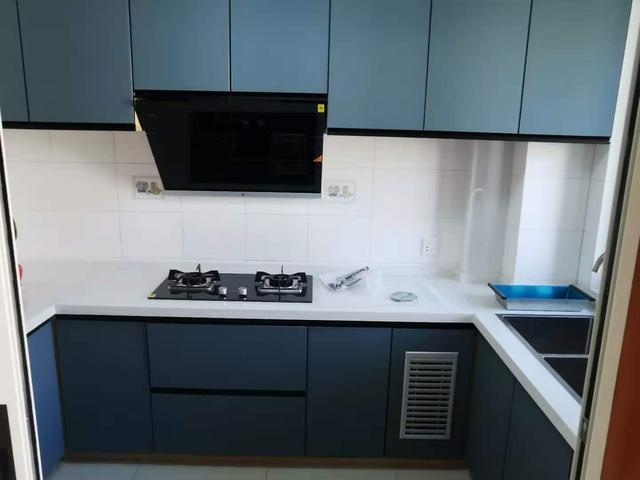 厨房也是家里翻新的重点,使用时间长后容易油污重,改造后的厨房,蓝色的橱柜清新舒爽,配上白色台面,使得整个厨房空间非常洁净。