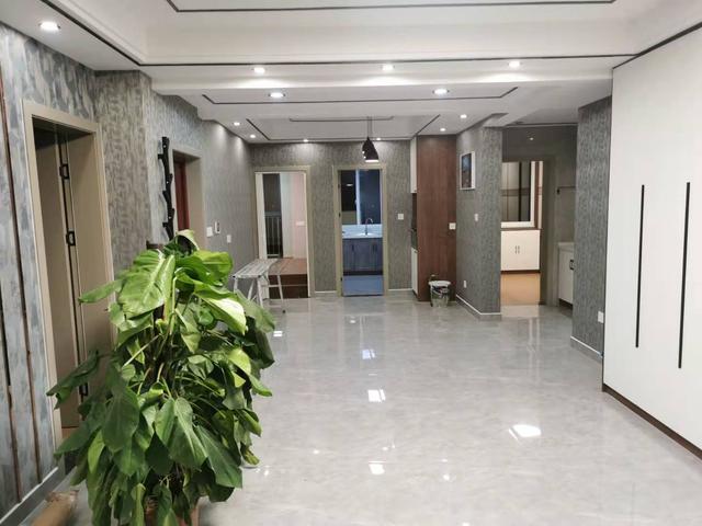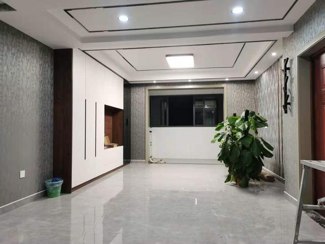 客厅的灰色瓷砖,搭配灰色墙纸,满满的高级感。简约大气的吊顶、金属条装饰,也是非常精致高级。电视墙做了收纳设计,白色柜门看起来清爽整洁。边上的盆景更是让整个客厅看起来生机勃勃。
