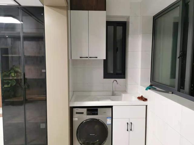 阳台的主要功能还是洗晒,所以业主家的洗衣机是选择放在阳台。一体台面方面日后清洁,顶上还做了吊柜收纳,整个阳台给人非常清爽的感觉。