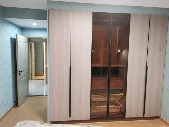 卧室为了更舒适的休息,所以选择了天湖蓝墙纸做背景色,红棕色橱柜也是非常漂亮。中间别出心裁的玻璃门设计,还能代替穿衣镜使用,非常棒哦~