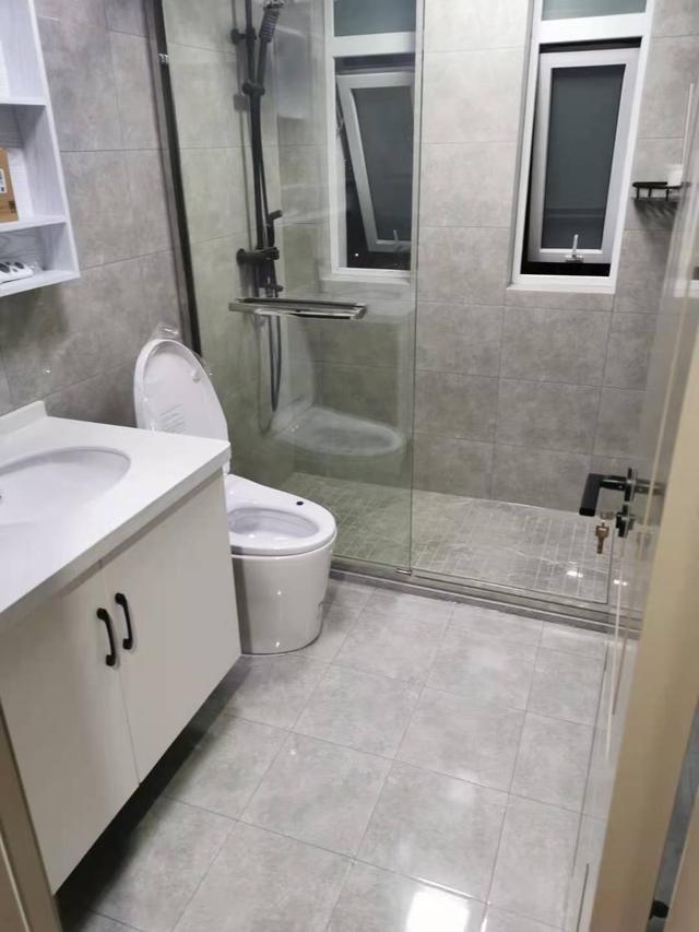洗手间也是以灰色为主,非常大气的设计。并且还做了干湿分离,用了不同的瓷砖做区分。另外,白色洗漱台干净整洁。