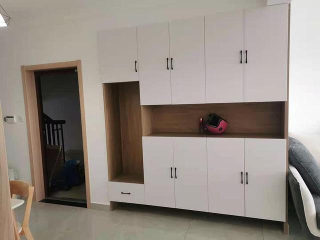 进门左侧的墙面设计成了鞋柜,整面橱柜,收纳能力非常强,靠门的地方留了空间,可以当做换鞋的凳子,非常巧妙。鞋柜中间留空摆放常用的物件,底部留空,收纳鞋子。