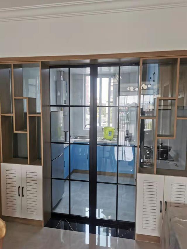 厨房选用玻璃移门,就连两边的橱柜都做成了半玻璃造型,增大光线的摄入,使得厨房与餐厅两个空间都非常通透敞亮。厨房里面,橱柜选用蓝色,显得清新自然。