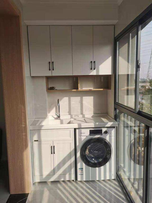 阳台收纳的非常整洁,一体台面方便日后清洁。台面上方,除了吊柜,还做了两个置物架,方便放取常用的物品。
