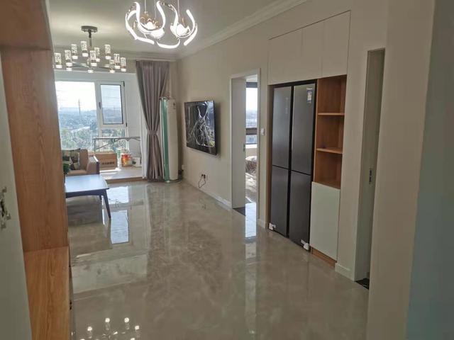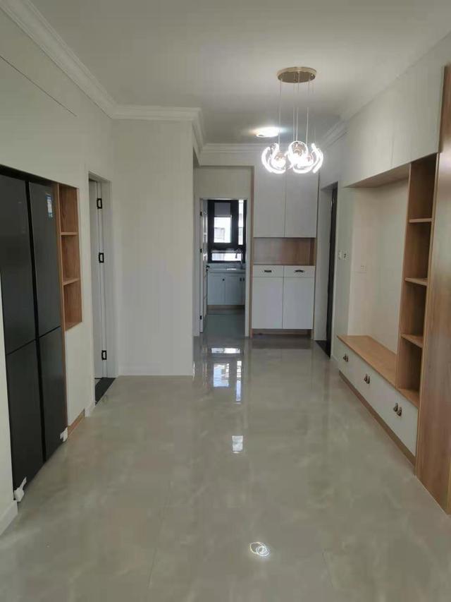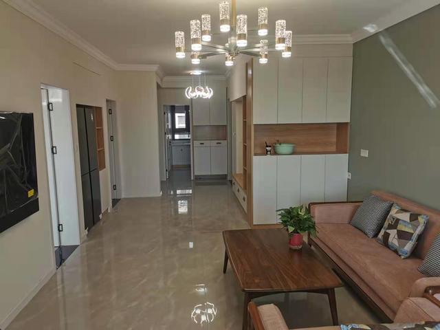 电视挂墙节省空间,冰箱放在了客餐厅,并且收纳进柜子,看上去整洁统一。