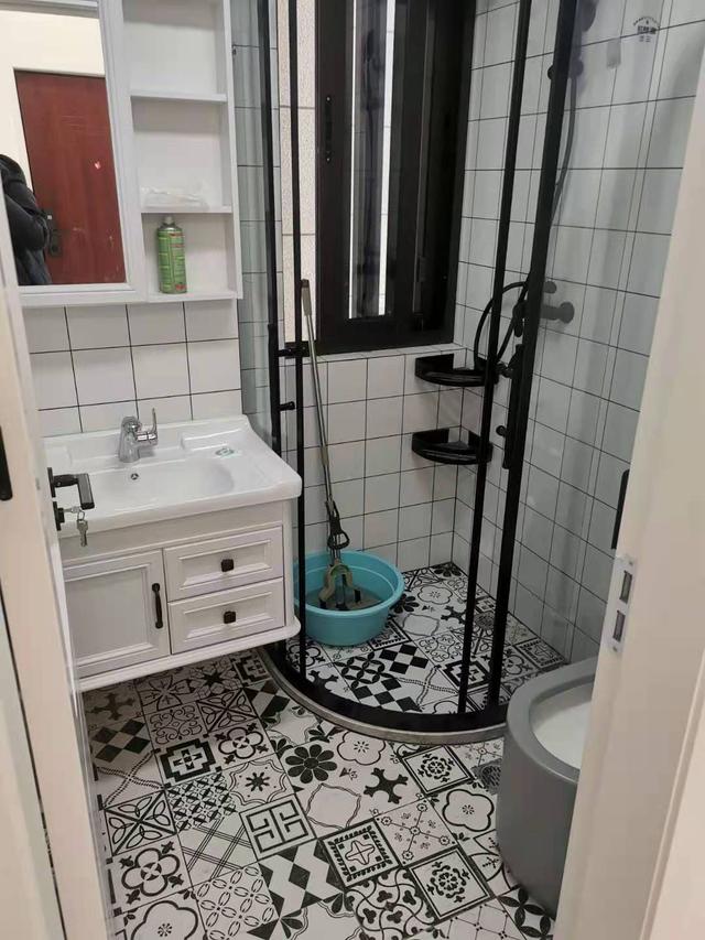 卫生间面积不大,所以在设计上更加注重空间的利用。转角圆形淋浴房,节省了空间。紧挨着淋浴房的洗漱台,一体台面便于日后打扫。地面上的不规则花纹地砖,个性又时尚。