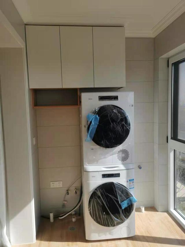 阳台还没有完全的弄好,但是基本的布局我们都可以了解到了。顶上做了吊柜用来收纳。中间做了置物架,用来摆放常用物品,非常方便。