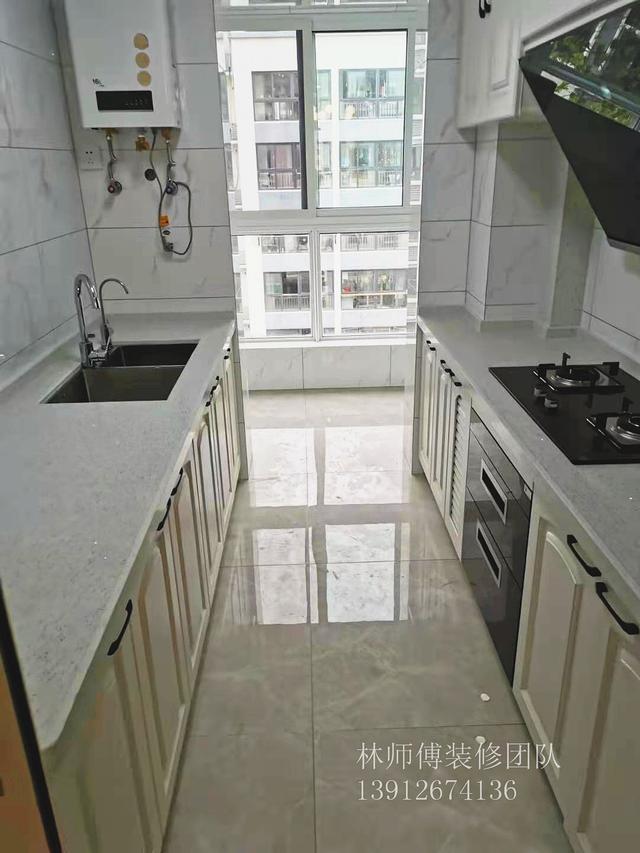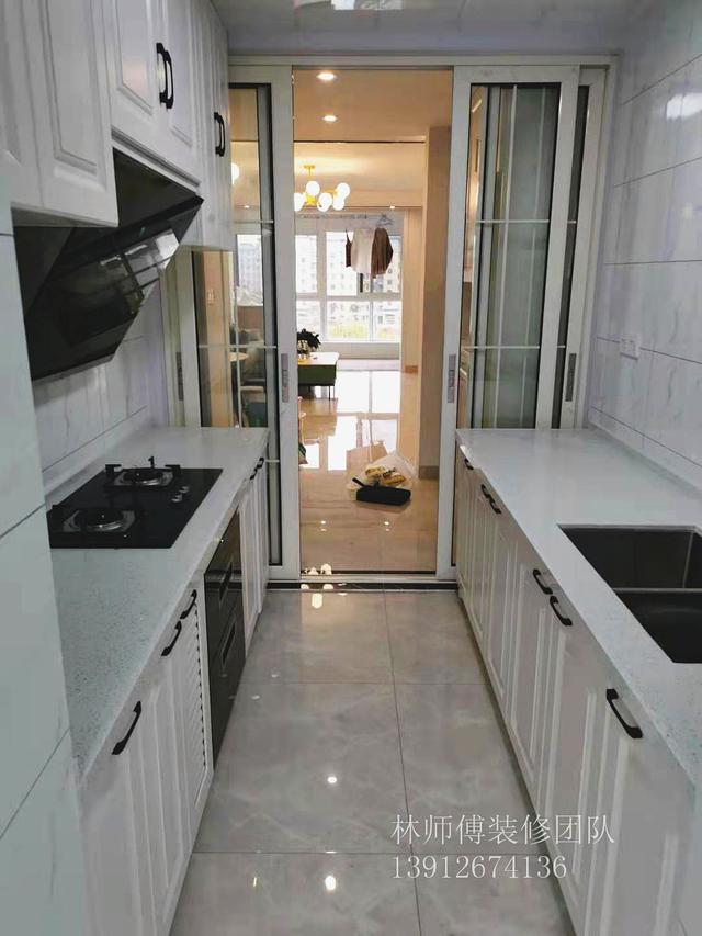 北面是厨房,白色为主的厨房,清爽整洁。由于北阳台的缘故,厨房设计成了二字型,一边配菜区,另一边烹饪区,转个身就行,非常便利。玻璃移门不挡光,通透又敞亮!