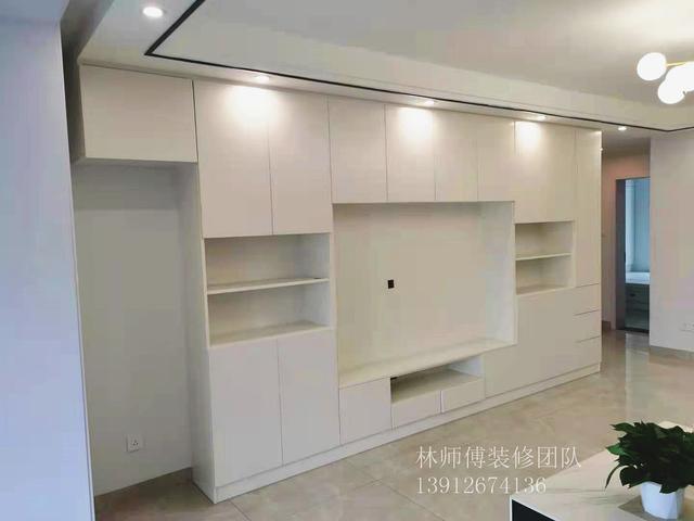 电视墙做了整墙橱柜,增加收纳能力,几个镂空格子,以后可以摆上饰品或者书籍,增加趣味,防止过于呆板。冰箱收纳在客厅,释放厨房空间,内嵌设计整体统一。