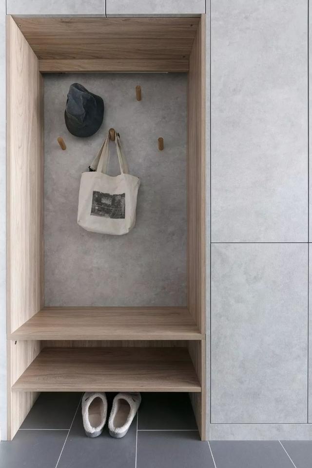 玄关柜结合更衣和换鞋功能一体设计,简洁实用又美观。