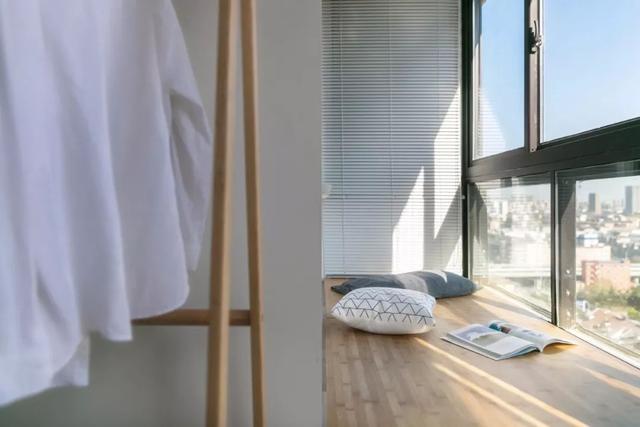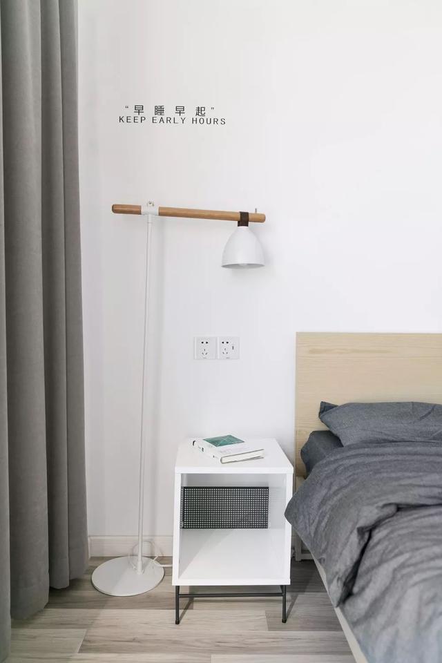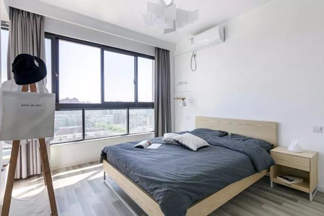 卧室整面窗户,让空间的视野格外开阔。白墙和木地板简洁朴实,搭配灰帘与个性吊灯,优雅而灵动。