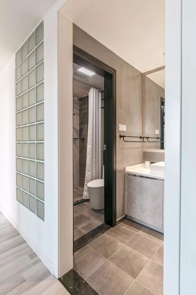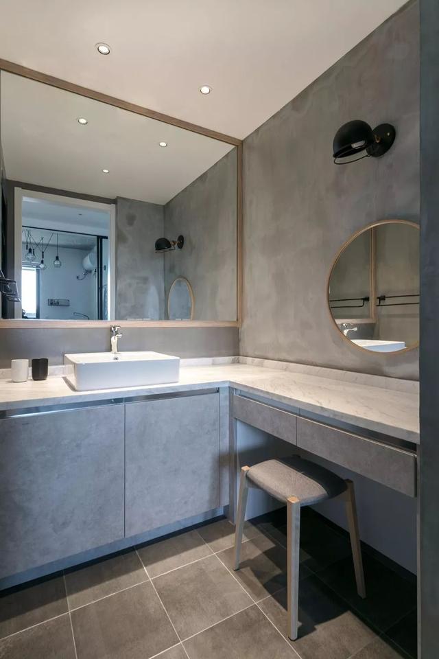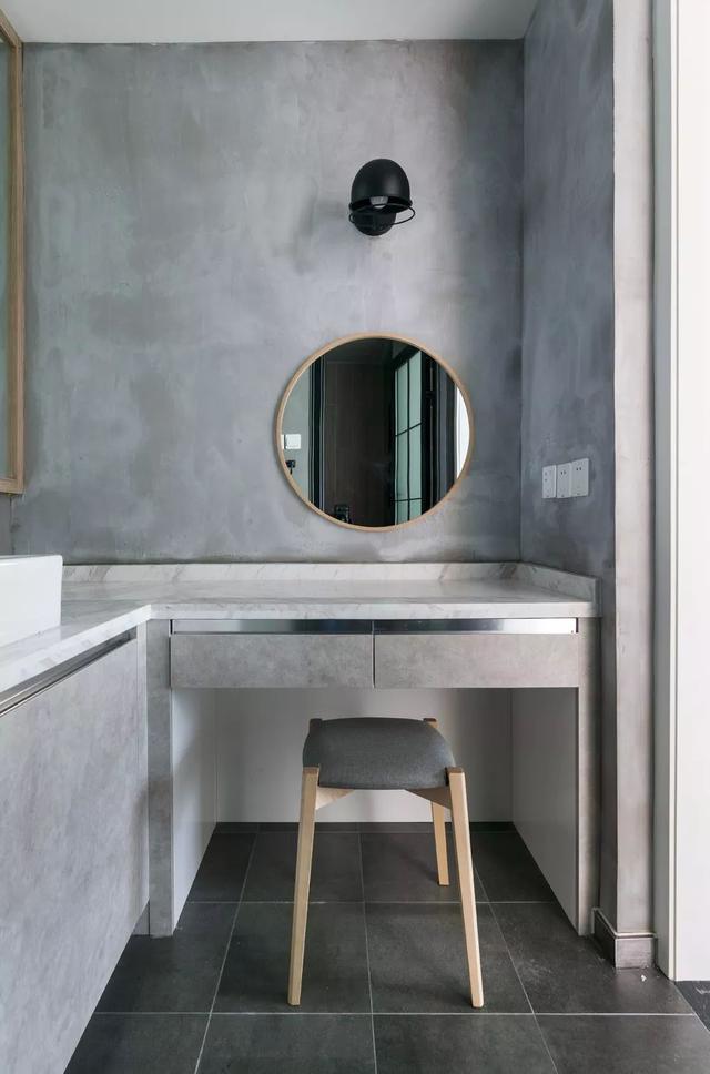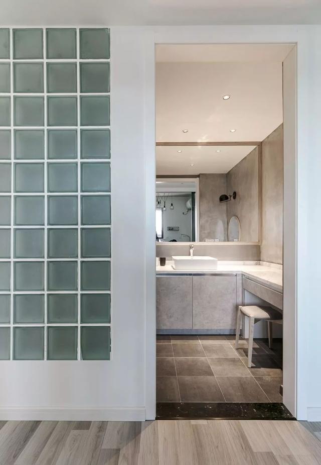 卫生间外的墙面采用玻璃砖做装饰,光线可以穿透,不会产生闭塞感。L型干区台面搭配水泥灰背景,加入木色线条与大面积墙镜,优雅而有质感。洗漱区与梳妆台的结合设计,很新颖,也方便女主人卸妆梳妆。