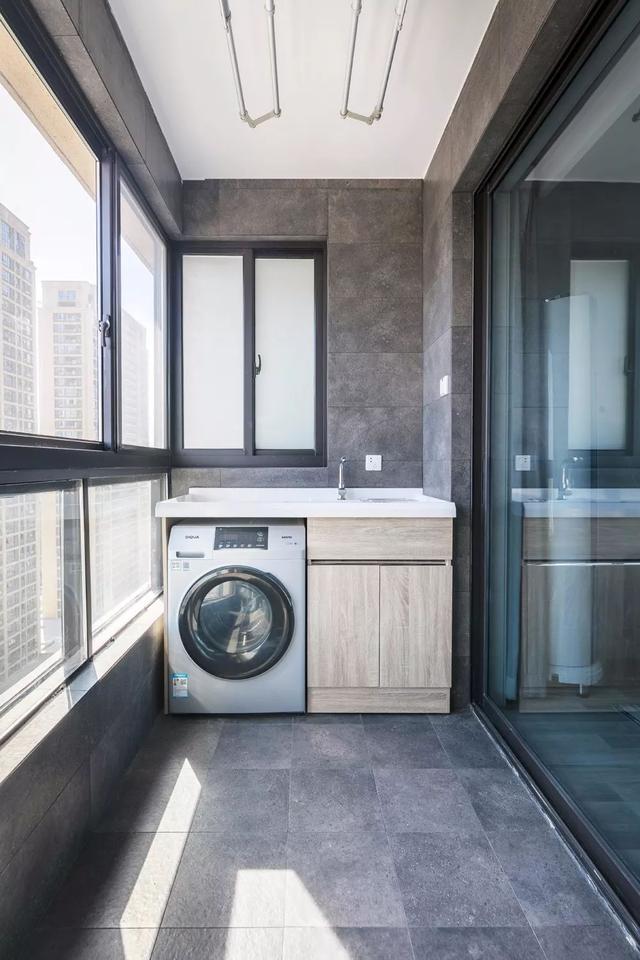 阳台主要是考虑洗衣及晾晒功能,整洁实用。地面与墙面通铺灰砖,与室内风格保持一致。