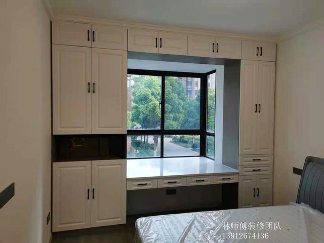 主卧也做了设计,飘窗变成了办公书桌,这非常适合那些需要把工作带回家处理的业主。而且飘窗两边也做了橱柜,增加房间的收纳能力。