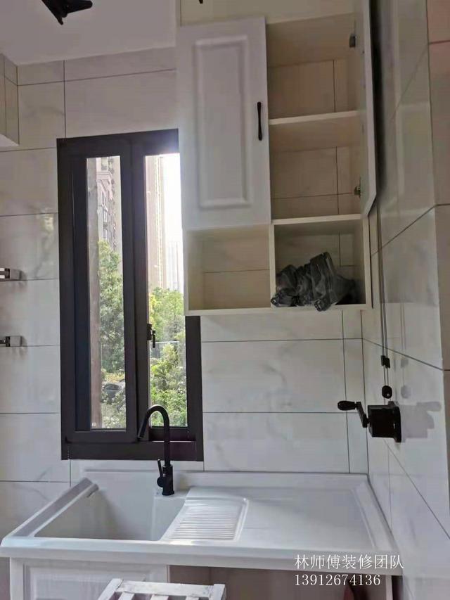 阳台的利用率也非常高,一遍是浣洗区,整体台面方便清洁。另一边做了整面橱辅助收纳。