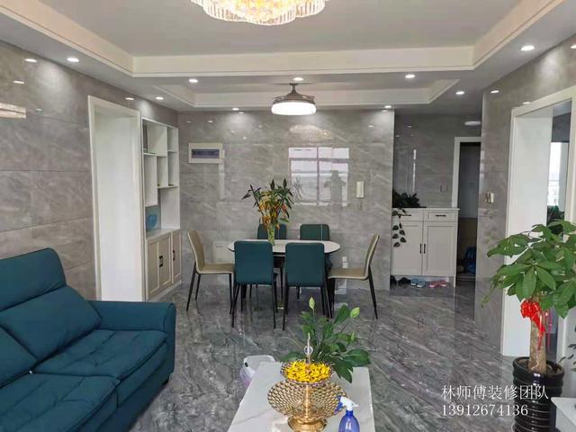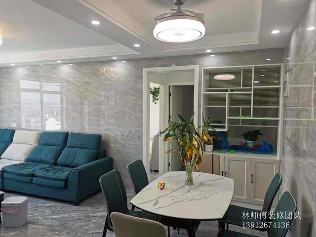 这是一套2房改3房的装修实景案例,整体以灰色为主,辅以蓝色软装点缀,并且客餐厅的墙面和地面都贴了瓷砖,让整个空间看起来更显高级与轻奢,虽然整体面积不大,但是装修的非常时尚舒适。