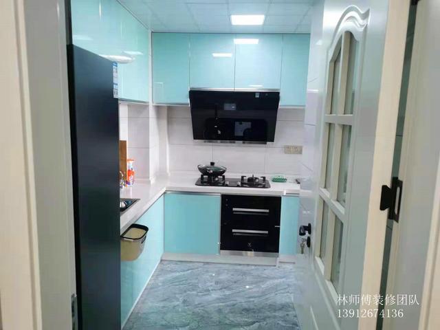 厨房的蓝色橱柜让人看了眼前一亮,非常清爽。L型设计,上下都做了橱柜,收纳能力棒棒的。