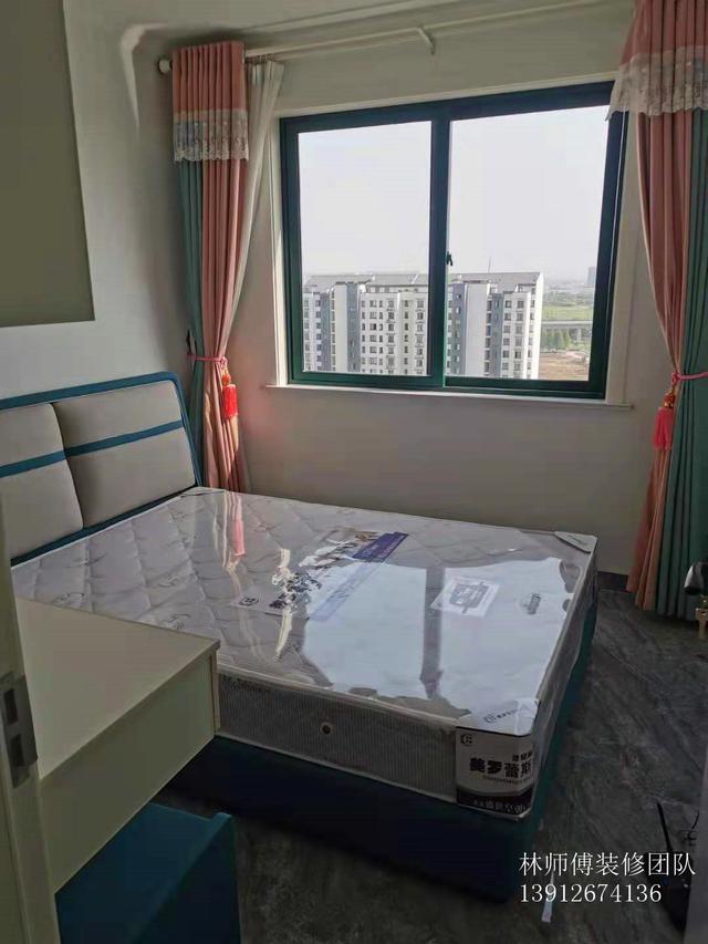 粉色+湖蓝色的拼色窗帘清新舒适。而且和床的颜色也很配套哦。