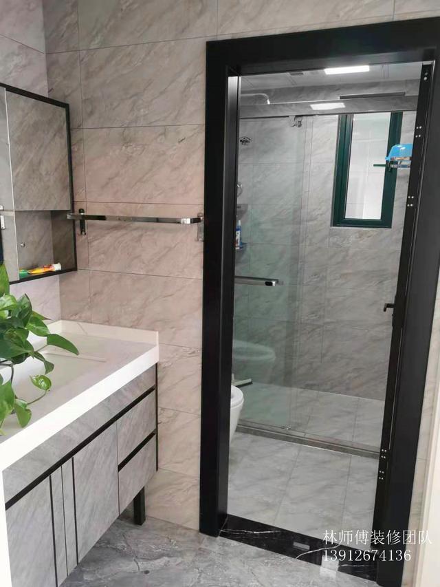 洗手间做了三分离,洗手池外移,避免了大家一起使用时的尴尬。里面也做了干湿分离,淋浴区做了玻璃移门隔断,防止水外溅。
