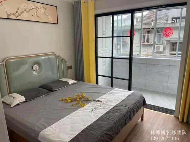 次卧也是以舒适为主,灰色床品呼应灰色墙面,整体统一。黄灰色的窗帘,在整体统一的布局下,也为房间增添了几分色彩。外面的阳台上做了橱柜辅助收纳,为小户型增加收纳能力。