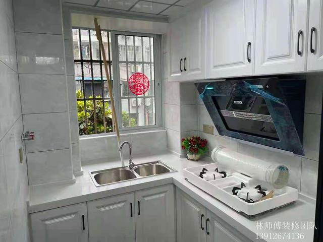 L型厨房符合日常动线,瓷砖和橱柜都是用的白色,显得空间大。